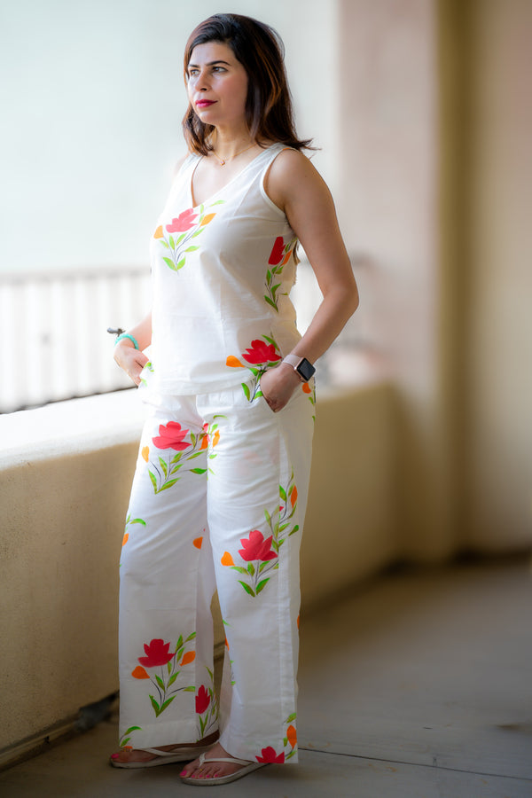 This vibrant 2-piece co-ord set is a modern, playful ensemble crafted from soft, breathable white cotton and adorned with hand-painted floral motifs in bold hues of red, orange, and green. This co-ord set combines artisanal...